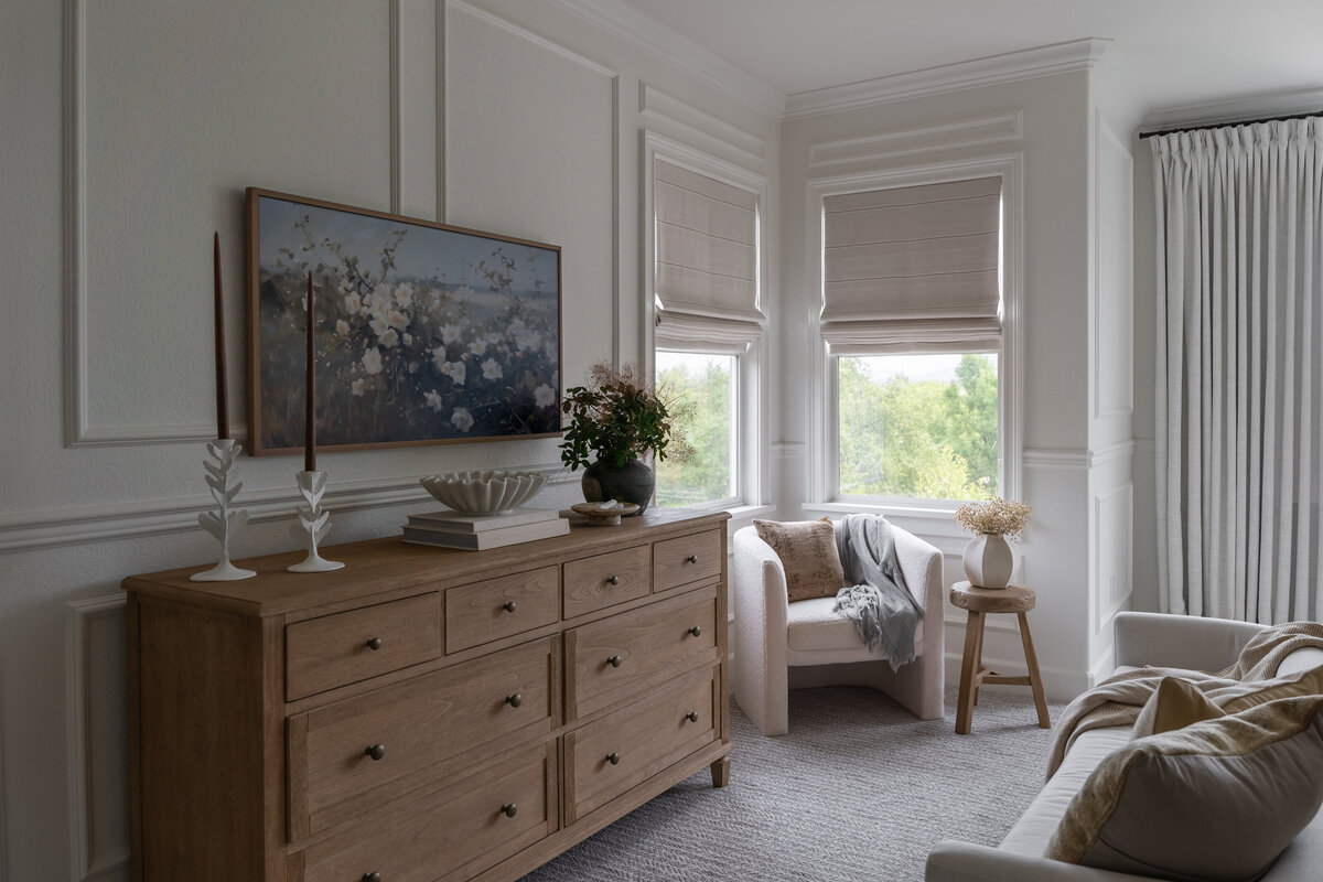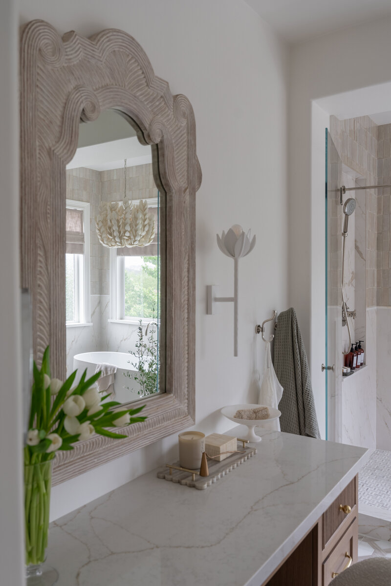 The kitchen became the heart of the project, outfitted with chef-worthy appliances, natural quartzite waterfall-edge countertops, a sleek appliance garage, and custom glass details that brought a unique character to the home. From flooring and lighting to window casings and tile, every element was thoughtfully updated to create a space that feels fresh, functional, and one-of-a-kind.