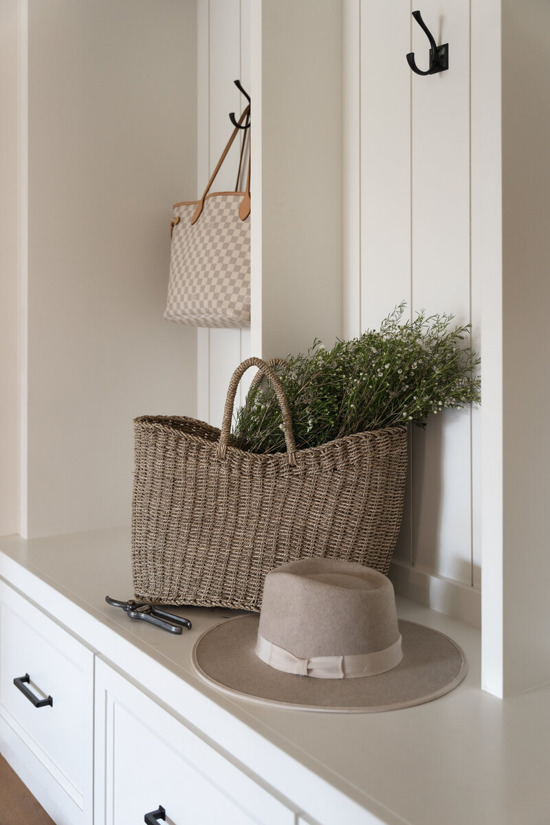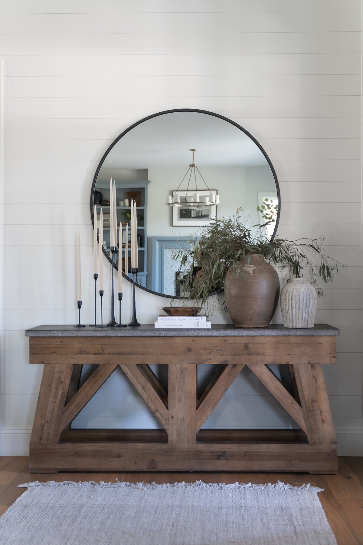 et on rolling acreage with views of a barn, horses, and a vineyard, this white modern farmhouse became a dream realized for a family of five. From the very beginning, the home carried deep meaning — during the framing stage, the family wrote Bible verses on the walls, weaving their faith into its foundation. Our goal was to honor that sense of heart and history by creating interiors that felt welcoming, lived-in, and nostalgic, even though their house was brand new.