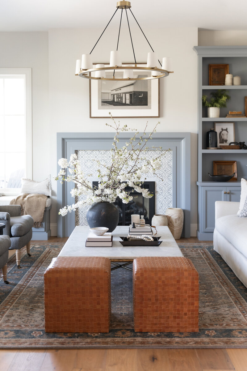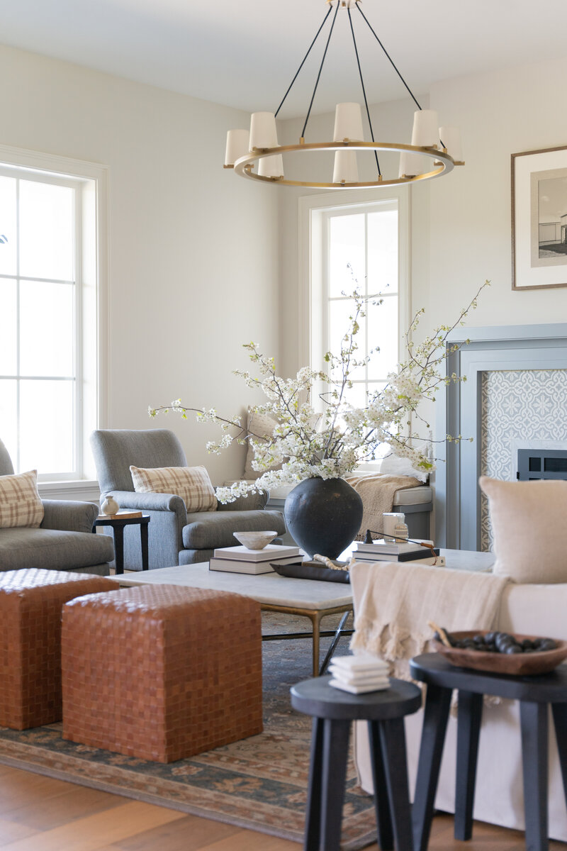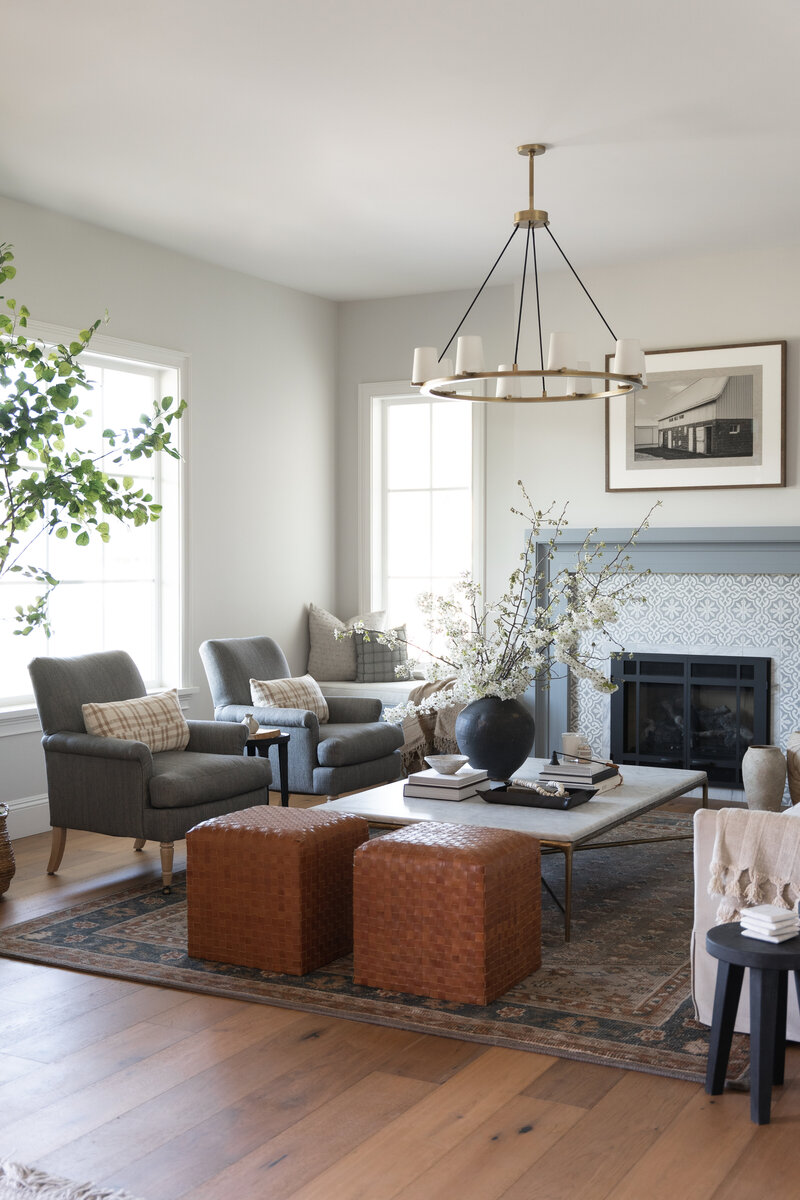 We furnished the entry, family room, living room, dining space, and master bedroom, and added thoughtful charm to the primary bathroom. Every detail told part of their story — from the photograph of our client’s grandmother’s farm above the fireplace to the layers of color and texture that make the spaces feel both timeless and personal. Each room blends comfort and character to reflect the family’s lifestyle and values.